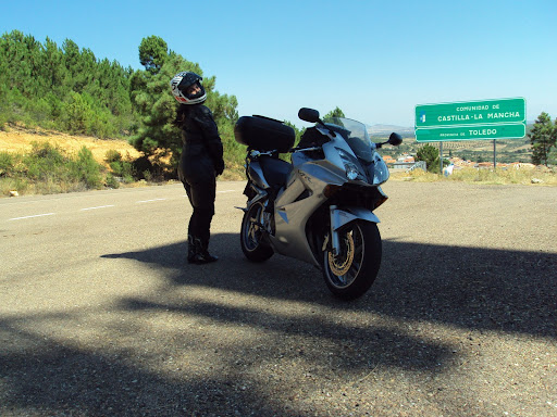 Salimos alrededor de las 9, porque no habia mucha prisa por llegar puesto que hariamos noche en Cazalla de la Sierra (Sevilla) y cogimos direccion A-5 hasta Talavera. Alli enlazamos con la N-502, el asfalto un poco estropeado pero de trazado mas o menos divertido. Seguimos hasta la Nava de Ricomalillo donde cogimos la CM-411, mejor asfalto y mas curvas  :D , la ruta esta siendo divertida. La primera parada tecnica con pinchito de panceta y primeras fotos la hicimos en el Puerto de San Vicente. A partir de aqui hasta el enlace con la EX-102 la carretera se hace mas divertida todavia, mas curvas de todas clases y el asfalto impecable, ademas de unos paisajes y vistas impresionantes  :babba: . Continuamos por la EX116 hasta la N430 para ir direccion Navalvillar de Pela, este fue el tramo mas aburrido de todo el dia con rectas bastante largas y amplias llanuras. De aqui nos dirigimos hacia Orellana y la ruta de los pantanos, impresionantes, hasta arriba de agua los dos, el de Orellana y el del Zujar. Seguimos por la EX103 hasta Castuera y de aqui a Llerena, donde paramos a comer y descansar un rato. Ya nos quedaba poco para llegar al destino de la primera etapa. Hasta Llerena no hizo demasiado calor, el reloj de la VTEC no pasaba de 28º, y alli llego a los 30º.